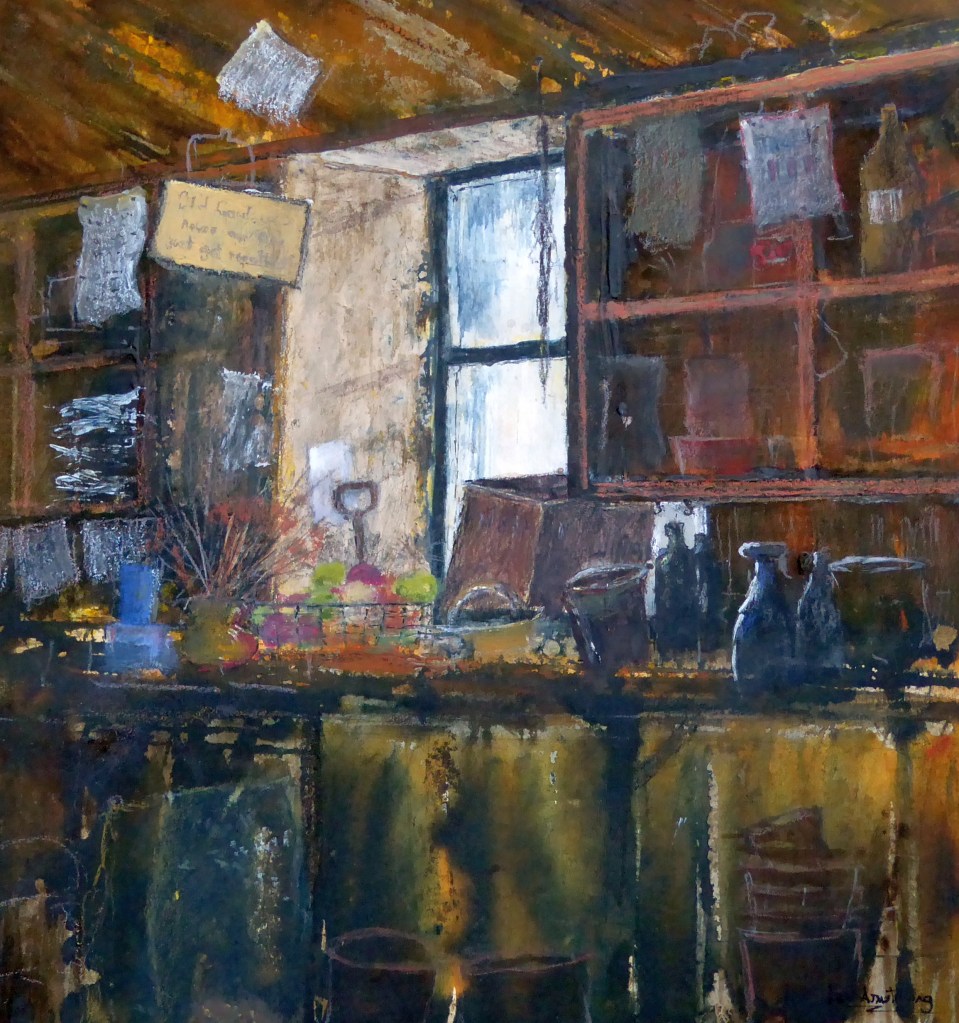 Gardener’s Shed £240 Mixed Media This is in the old walled garden at Gunby Hall in LIncolnshire and typical of many similar sheds all over the land in large gardens. Great fun to paint.