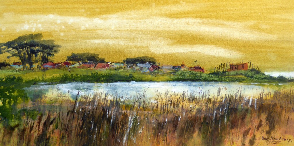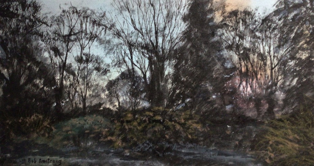 Winter Dawn £150 Mixed Media. I was up early one morning last winter and struck by the light in the garden as the sun just started to make its presence felt. So I just grabbed the phone and took a quick shot through an upstairs window and went back to bed. (I assume you’ve already worked out why I was up at that time of day!) I painted this later on the same day and thought no more about it and then decided to frame it just recently.