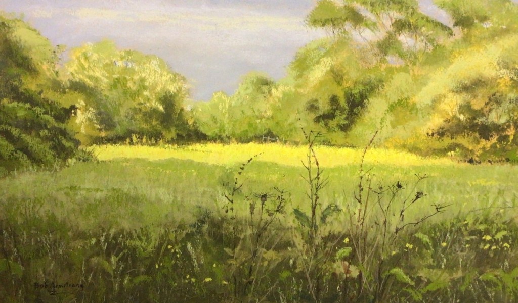 Midsummer Evening £260 Acrylic, Pastel & Monoprint. The summer of 2025 was hot. So hot we took to walking almost every evening around the village after our evening meal and the light was really striking. I decided to paint this simple scene at the end of Church Lane and used actual vegetation dipped in paint and laid on the surface to create the foreground weeds. Great fun being a painter, you just make your own rules up as you go along!