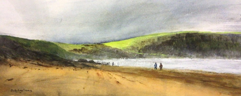 Wild Day, Woolacoombe £275 Mixed Media. One autumn day we went to this lovely part of North Devon with family and as soon as I saw that patch of light on the distant hill I knew there was a painting in it for me. It was so windy I could hardly stand, very exhilarating and the sea was whipped up into a fury. there weren’t any swimmers!